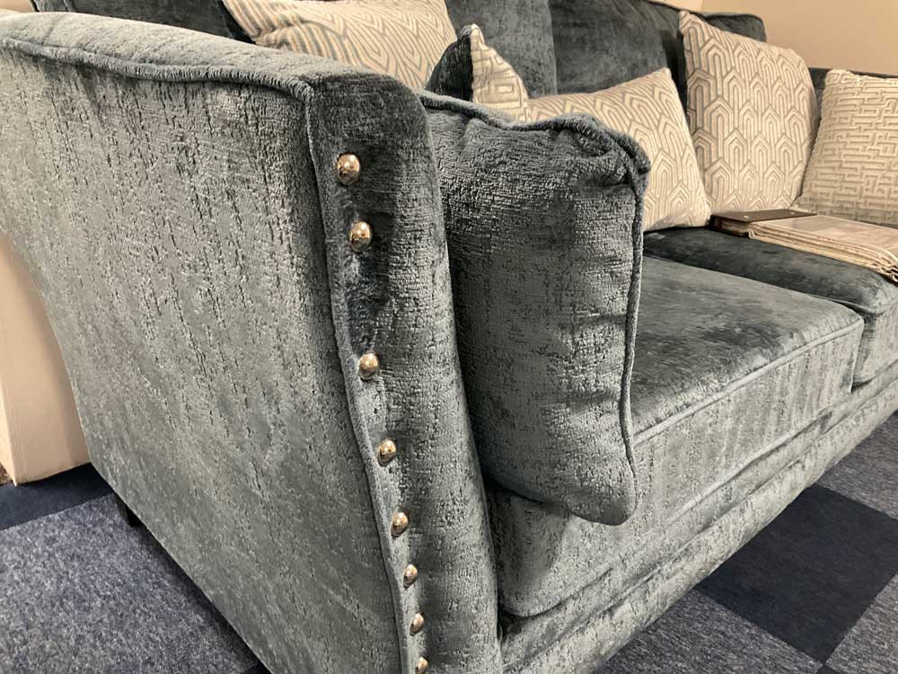 High arms cushioned by soft bolsters to wrap you in stylish comfort, the glorious finishing touches are the stunning metal studs shinning like jewels.