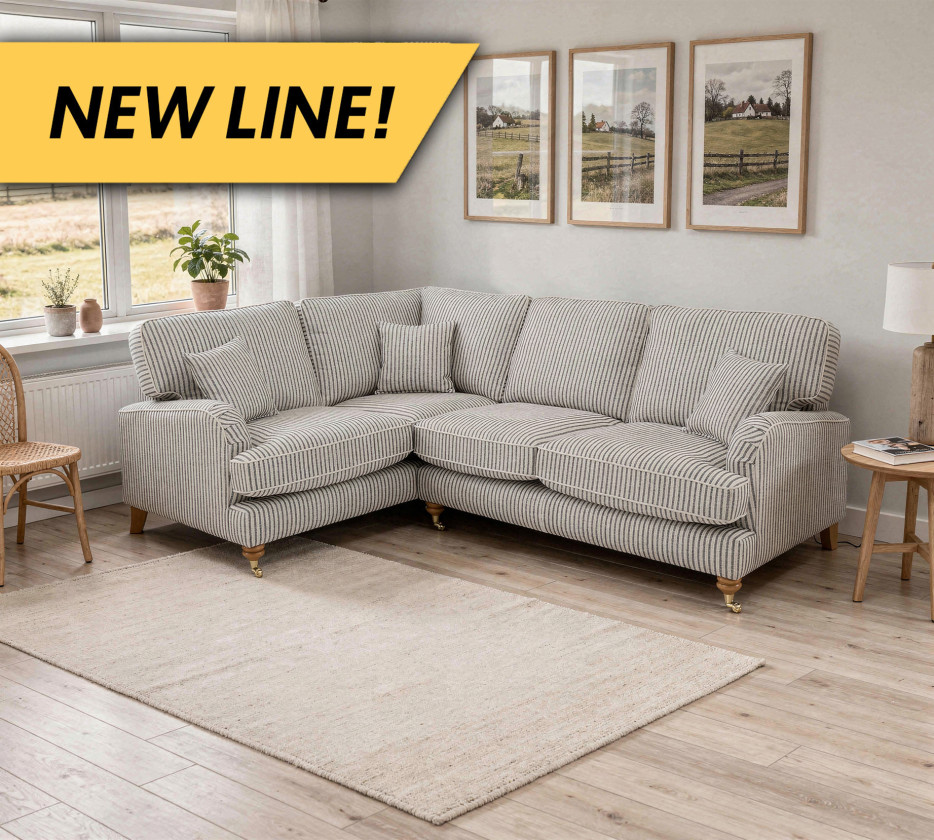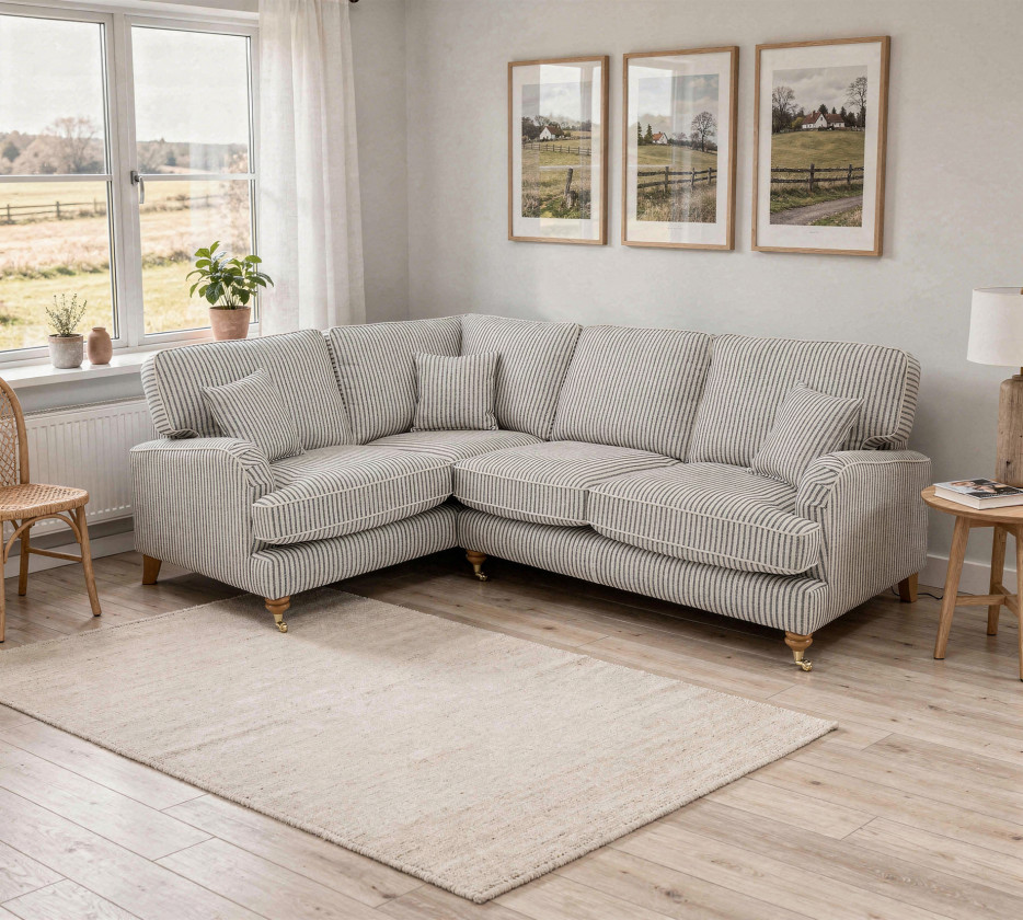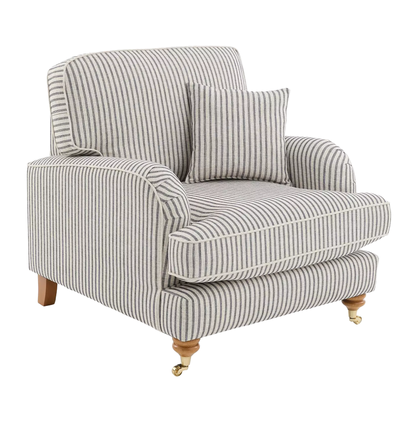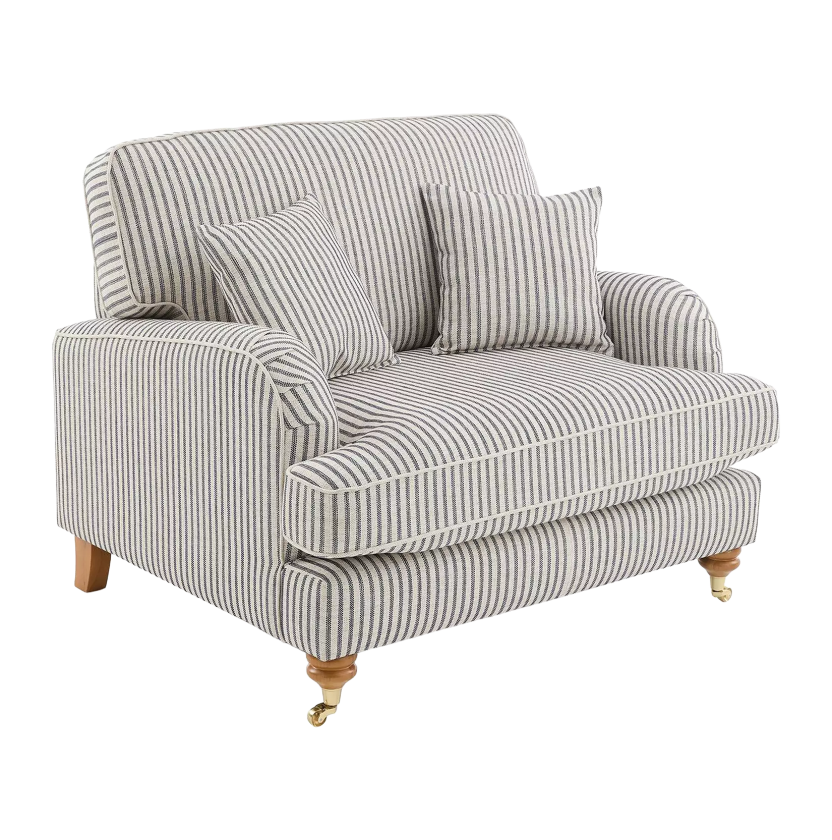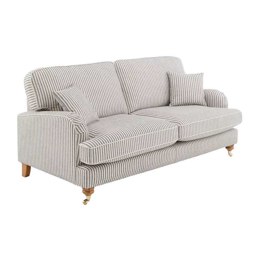 The Padstow masterfully blends traditional English countryside charm with a breezy, coastal aesthetic. Upholstered in a timeless ticking stripe fabric, the vertical pattern provides a crisp, structured look that elongates its classic silhouette, while being brought up to date by the use of soft chenille yarns offering comfort as well as traditional styling. The design features elegant scroll arms, tailored piping for a high quality finish. Every detail, from the neat piped edging to the matching scatter cushions, reflects a commitment to high-quality craftsmanship and enduring style.